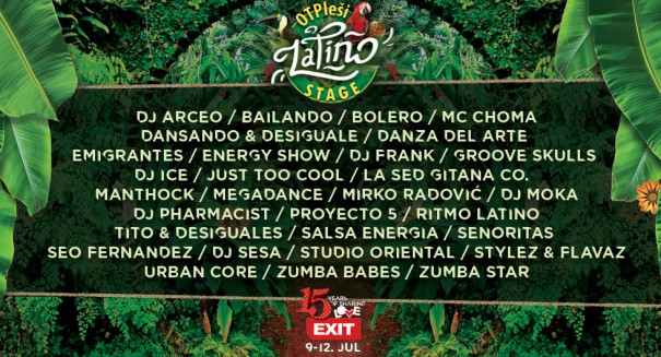 Egzotični plesovi i muzika koja pokreće i najskeptičnije, nalazi se na jednoj od najživljih bina, čije ime poziva na pravu akciju – OTPleši Latino! Pun energije i tropskih koreografija, ovaj stejdž prevodi najrazigraniji član Exit ekipe, kubanski majstor plesa Čoma Sumba Garsija, koji publiku četiri noći vredno uči nove plesne korake uz glasne latino ritmove izvođača i plesača iz svih krajeva sveta! U četvrtak, 9. jula na OTPleši Latino bini nastupiće Studio Oriental, a uz njih i Bolero, DJ Frank, DJ Ice, MC Choma, Ritmo Latino, Stylez & Flavaz, Tito & Desiguales i Urban Core. Glavne zvezde drugog dana festivala na karnevalskoj bini biće Sed Gitana, a uz njih će nas ponovo zabaviti Bolero, potom DaNSANDO & Desiguales, Mega Dance, DJ Moka, DJ Pharmacist, Salsa Enegia, Senoritas, uz neizbežno vrckanje u ritmu Zumba Star. U subotu, 11. jula nas na Latinu očekuje Proyecto 5, ali i Groove Skulls, Manthock, MC Choma, DJ Pharmacist, Ritmo Latino, DJ Sesa, Tito & Desiguales i Zumba Star. Konačno, poslednjeg dana festivala prijatne upale mišića od đuskanja lečimo uz Mirka Radovića, kao i DJ Arceo, Bailando, Just 2 Cool, DJ Moka, Salsa Energia, Urban Core i Zumba Babes!