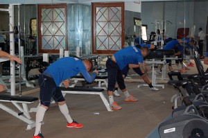 Prvi deo nedeljnog prepodnevnog treninga protekao je u teretani. Igrači su vežbali na spravama po planu i programu kondicionog trenera Vladimira Živanovića. Zatim, jer nije bilo kiše, jedan sat rada na obližnjem terenu, igrači su došli u kontakt sa loptom, bilo je to uigravanje određenih akcija sa šutevima na gol. Ekipa od starta radi žestokim tempom, pa su istegnuća i lakše povrede prateći faktor.