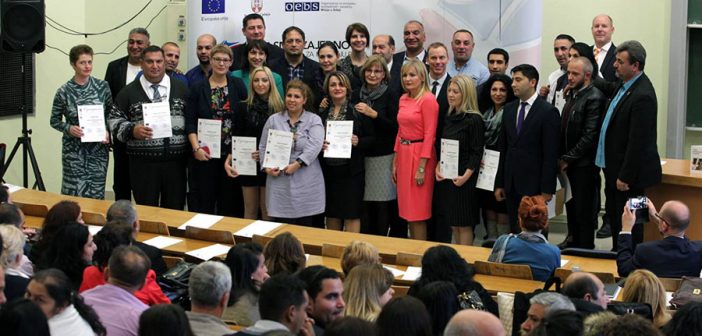 Projekat „Ovde smo zajedno – Evropska podrška za inkluziju Roma“, vredan 4,8 miliona evra, finansira Evropska unija i sprovodi Misija OEBS-a u Srbiji, u koordinaciji sa Kancelarijom za ljudska i manjinska prava. Od juna 2013. godine, projekat podržava sprovođenje Strategije za unapređivanje položaja Roma u Republici Srbiji u odabranim oblastima kao što su pristup osnovnim pravima, građansko učešće, obrazovanje, zdravstvena i socijalna zaštita, adekvatno stanovanje i kreiranje novih poslova.