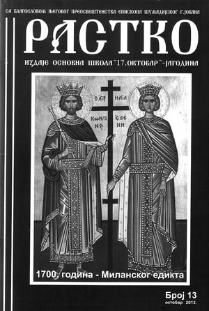 Odobrenjem direktora Osnovne škole „17. oktobar” iz Jagodine Biljane Milanović, sa blagoslovom Njegovog preosveštenstva episkopa šumadijskog gospodina Jovana a uz saglasnost koordinatora za veronauku namesništva beličkog eparhije šumadijske jereja Milomira Todorovića zahvaljujući darodavcu – Skupštini grada Jagodine, povodom pola veka postojanja i uspešnog rada ove škole, iz štamparije „Papirkomerc” na više od 50 strana formata A-5 ovih dana pojavio se iz štampe 13. broj časopisa „Rastko” koji je, najvećim delom, posvećen jubileju – 1700 godina od Milanskog edikta.