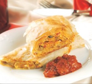 500 g kora za pitu, 8 kašika ajvara, 300 g sira, 3 jajeta, kesica praška za pecivo, 400 g šampinjona, ulje, so, biber