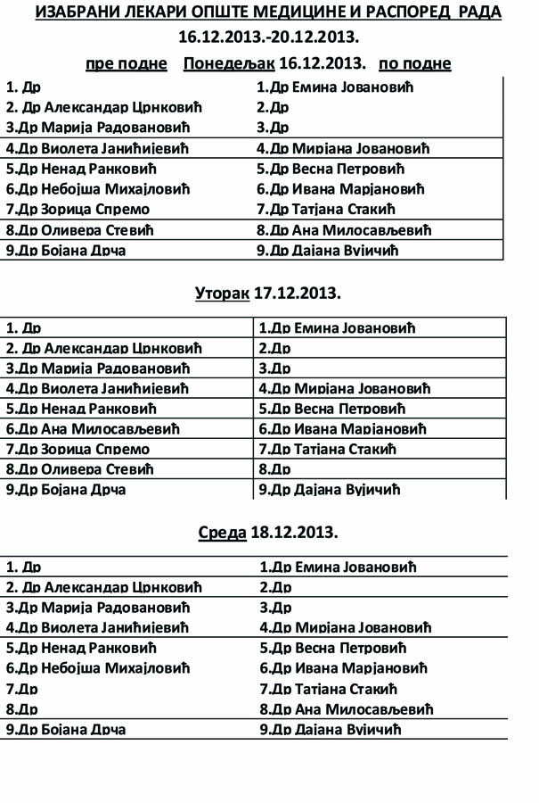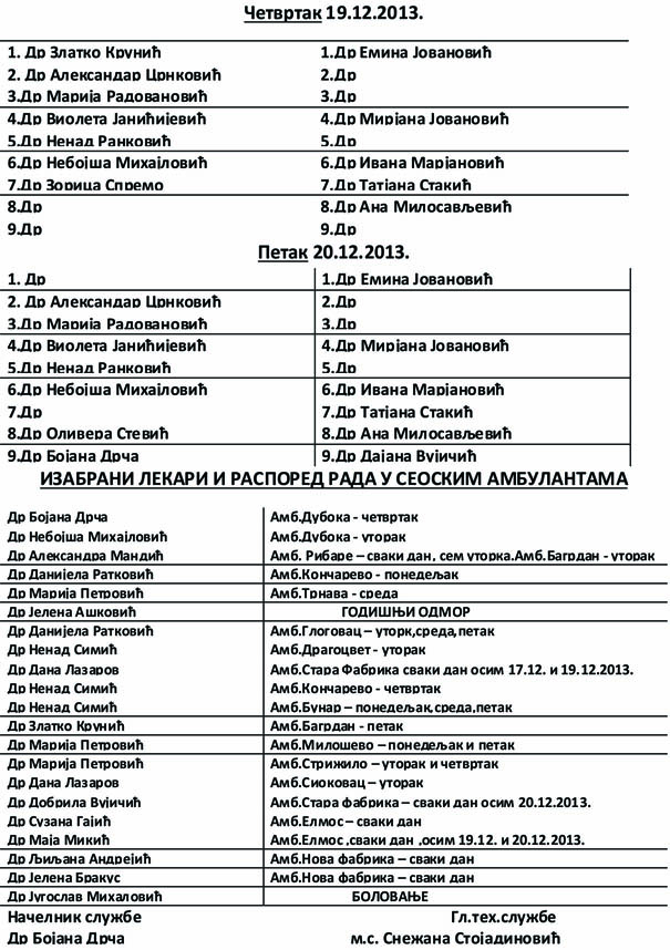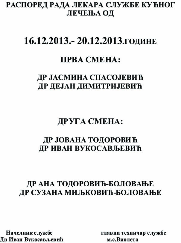 Pogledajte raspored rada izabranih lekara opšte medicine od 16. do 20. decembra 2013. godine, kao i raspored rada lekara službe kućnog lečenja u istom periodu.
