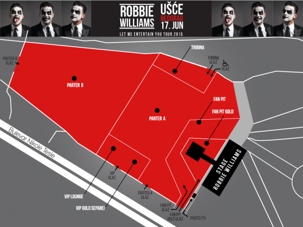 Robi Vilijams danas stiže u Beograd privatnim letom, sa ostatkom svog tima i na sopstvenu želju obilaziće grad i večerati u srpskoj prestonici pred sutrašnji koncert na Ušću! Kompletan produkcijski tim doputovao je u prethodna dva dana i na Ušću je sve spremno za spektakl na kojem se očekuje između 30.000 i 35.000 ljudi, budući da je za vikend kapacitet proširen zbog velikog interesovanja. Kapacitet regularnog Fan Pita, kao i Gold Fan Pita, prostora neposredno uz binu i pistu po kojoj tokom koncerta hoda Vilijams, jedini su ostali nepromenjenog kapaciteta.