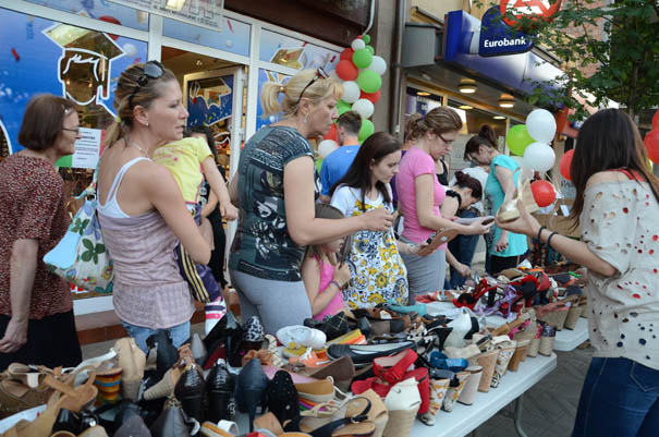 Gotovo isključivo žene tiskaju se ispred štanda sa obućom koju je agilni trgovac tokom protekle noći ponudio po sniženim cenama u toku ,,Noći muzeja” ispred svog lokala u Jagodini.