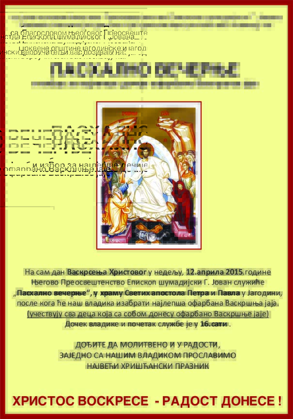 Pozivamo Vas da na sam dan Vaskrsenja Hristovog u nedelju, 12.aprila 2015.godine učestvujete u izboru za najlepše Vaskršnje jaje. Kao i svake godine na sam dan praznika Njegovo Preosveštenstvo Episkop šumadijski G. Jovan služi „Pashalno večernje“, u hramu Svetih apostola Petra i Pavla u Jagodini, posle koga će naš vladika izabrati najlepša Vaskršnja jaja. Doček vladike i početak službe je u 16.sati . Sva deca koja donesu ofarbano Vaskršnje jaje dobiće nagradu (ikonicu) i time učestvuju u izboru za glavne nagrade. Posle proglašenja pripremili smo za sve Vas bogati kulturno – umetnički program.