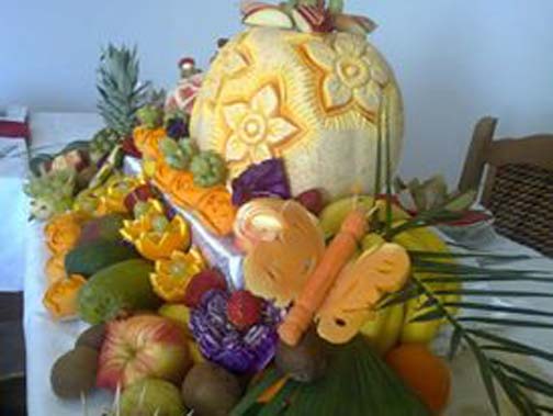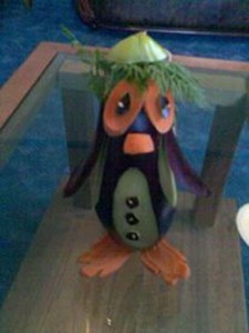 – Ne pravim crteže, niti u glavi imam sliku što želim da napravim. Čim vidim voće i povrće odmah znam šta bih mogao od toga da napravim. Pingvine, na primer, pravim od plavog paradajza, ježa od kruške i zrna grožđa koje poređam po čačkalicama, od jabuke pravim smajlija, labudove, ptice, cveće, šargarepu pretvorim u leptira, a crni luk u hrizantemu- kaže Vladimir.