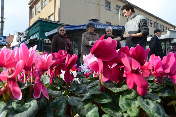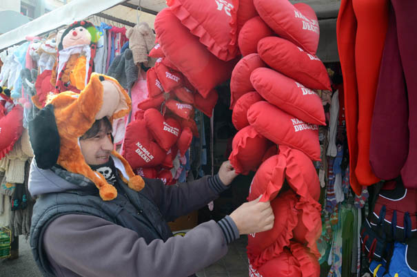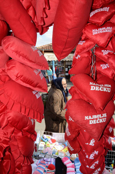 Trgovina tekstilnim srcima upadljivo crvene boje i cvecem, na ulicnim standovima u Jagodini danas na Dan zaljubljenih. Ovaj praznik, jedan od najpopularnijih na zapadu, poslednjih godina se sve vise obelezava i u Srbiji, uglavnom darivanjem dragih osoba poklonima kao sto su tematske cetitke, buketi cveca, bombonjere ili nekom drugom sitnicom najcesce u