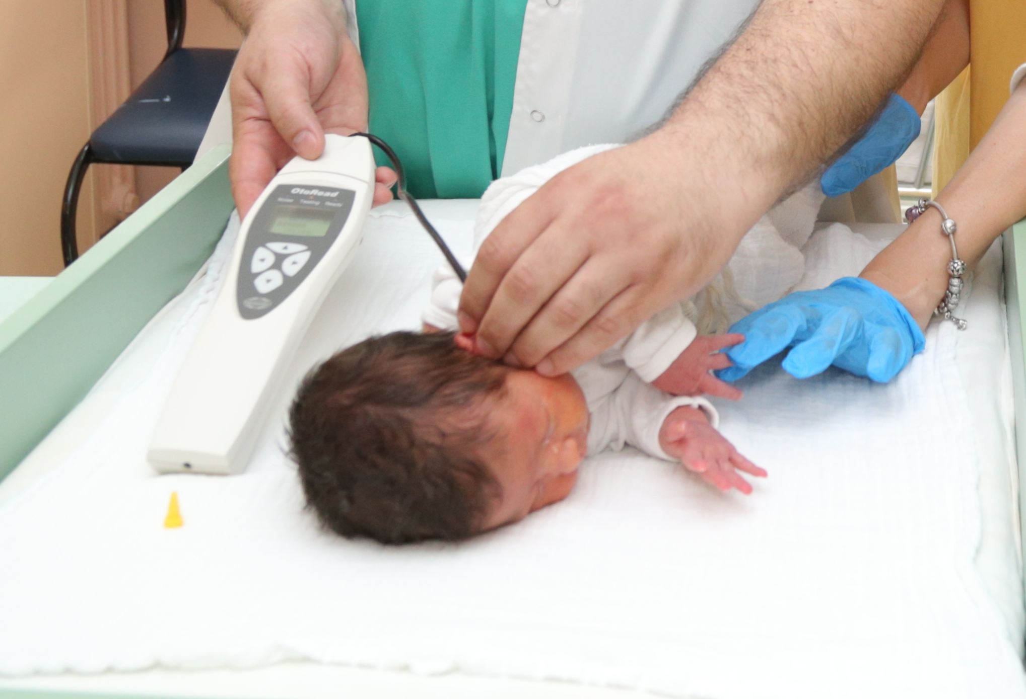 -Oštećenje sluha kod beba predstavlja veliki socijalni problem ako se ne otkrije u prvih 6 meseci nakon rođenja (rana dijagnostika), jer kasnije može doći do zastoja u psiho-motornom razvoju. Ispitivanje oštećenje sluha kod beba aparatom, predstavlja neinvazivnu dijagnostičku proceduru koja se izvodi kad dete spava i traje od 10 do 60 sekundi i nakon tog vremena se očitava rezultat. Aparatom se otkriva da li postoji sumnja za oštećenje sluha, i to predstavlja skrining metodu. Sonda aparata koja ima mikrofon i zvučnik, uvodi se u ušni kanal do graničnika, a na kompjuteru se očitava izostanak oto-akustičke emisije (OAE) na eho efektu (pozitivno na oštećenje sluha) i povezano je za oštećenje receptora u kohlei – pužu (unutrašnje uvo). Dodatna obrada takvih pacijenata vrši se u tercijarnim ustanovama, posebnim Audiološkim centrima, gde se vrši dalja dijagnostika (ispitivanje moždanih talasa kod beba – Bera metoda), radi utvrđivanja stepena oštećenja sluha. Lečenje se sprovodi slušnim aparatom, pomoću koga se vrši slušna rehabilitacija i ugrađivanjem kohlearnog implantanta. U lečenju se uključuju defektolozi i logopedi.
